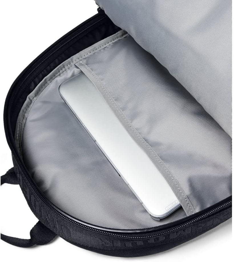 Water-resistant UA Storm technology keeps your stuff dry. Soft-lined laptop sleeve holds up to 15″” MacBook Pro® or similarly sized laptop. 1 zip-shut main compartment & large, zippered valuables pocket at the front. Center front drop-in water bottle pocket. Jacquard wordmark webbing across top. Top grab handle. Dimensions When Full: 11.8″”W x 17.7″”H x 5.1″”L. Volume: 25.5 L. 100% Polyester.